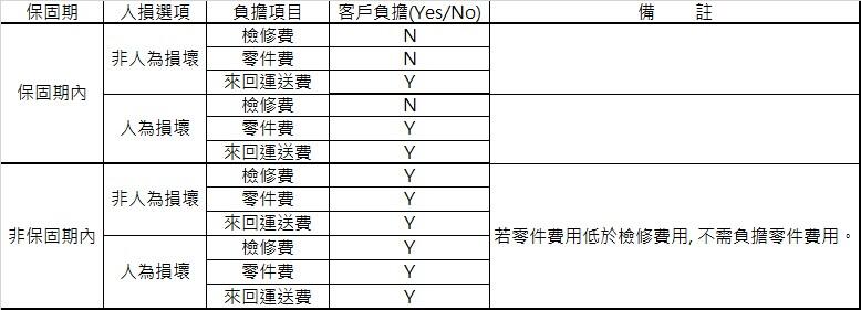 - Central Area: NT$3,000 (tax excluded); parts costs will be quoted separately.